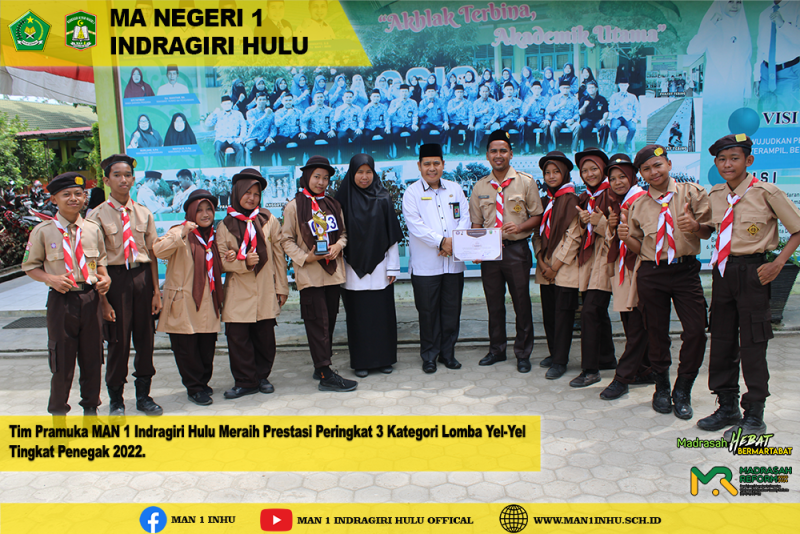 Selamat kepada Tim Pramuka MAN 1 Indragiri Hulu meraih prestasi peringkat ke-3 Kategori Lomba Yel-Yel tingkat penegak 2022. Kegiatan perlombaan di selenggarakan di kantor Camat Rengat Barat.  Untuk Tim Pramuka MAN 1 Indragiri Hulu tetap tetap semangat dan teruslah beralatih. (hd)