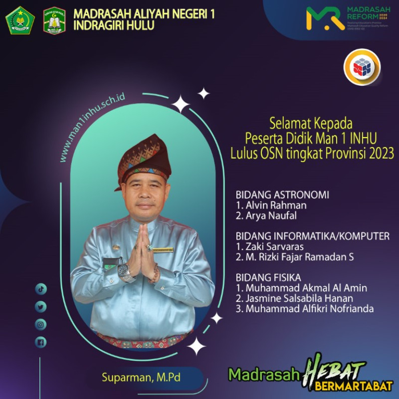 SELAMAT KEPADA PESERTA DIDIK MAN 1 INHU PEMENANG OSN-K 2023. BERSIAPLAH MENGIKUTI TAHAP SELANJUTNYA OSN-P 2023.