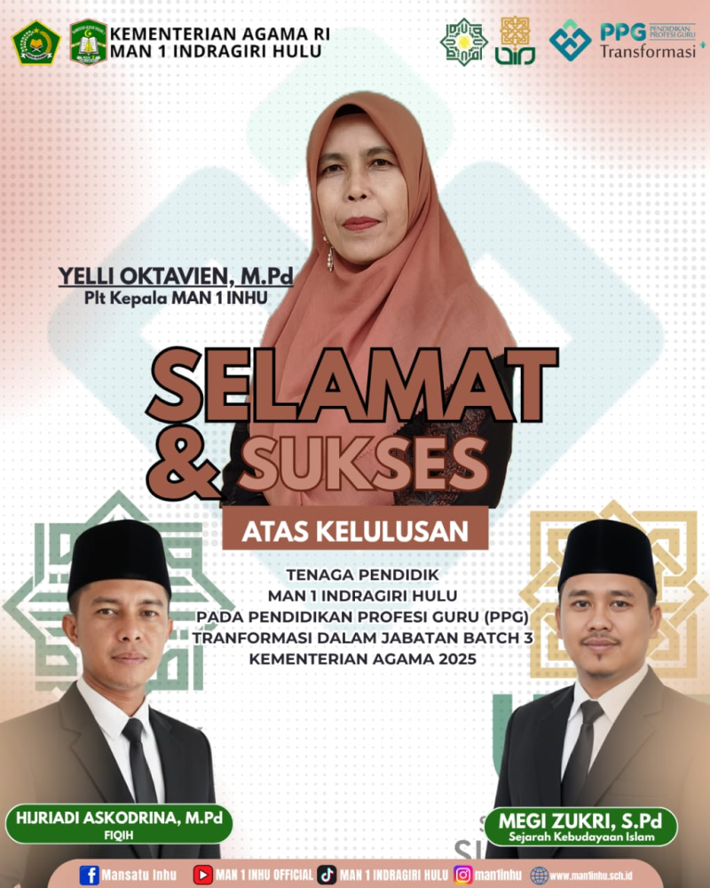 Keluarga besar MAN 1 Indragiri Hulu turut mengucapkan selamat dan sukses atas prestasi yang diraih. Semoga ilmu dan pengalaman yang diperoleh dalam program PPG ini dapat menjadi inspirasi dalam menciptakan generasi madrasah yang cerdas, berakhlak, dan berdaya saing tinggi.